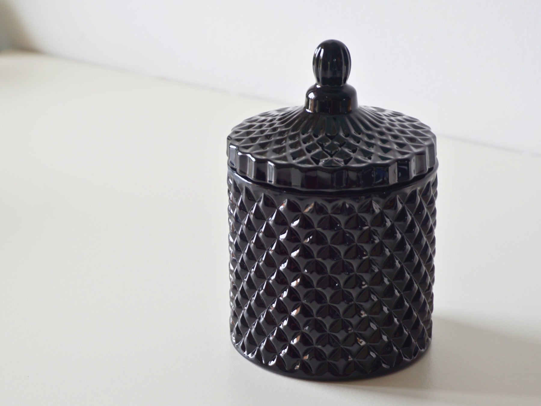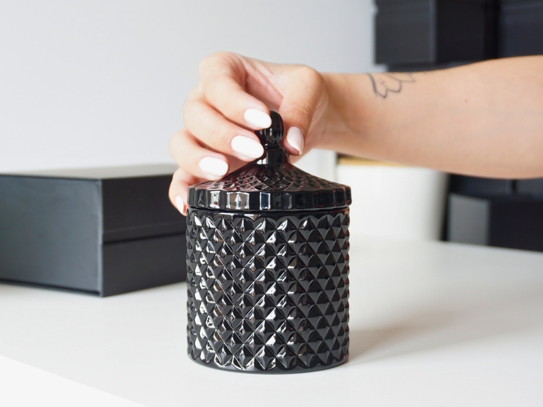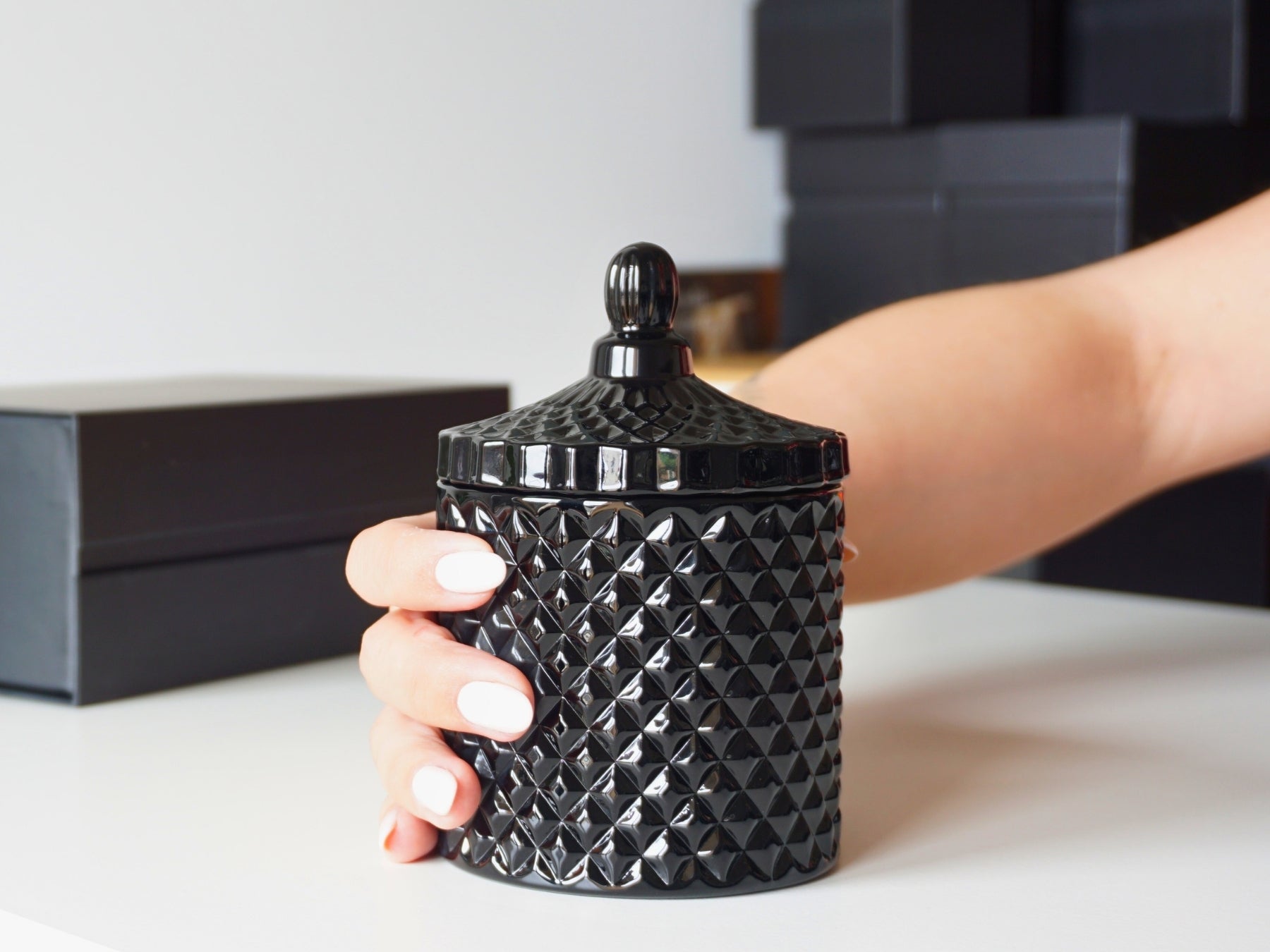 La nostra candela Ombre Leather è disponibile in barattoli di vetro nero da 230 ml con coperchio in vetro. Questi barattoli possono essere riutilizzati in seguito in casa, così come per altre candele, candele ricaricate.